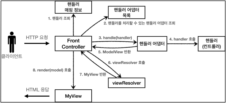 - ModelAndView 반환: 핸들러 어댑터는 핸들러가 반환하는 정보를 ModelAndView로 변환해서 반환한다.