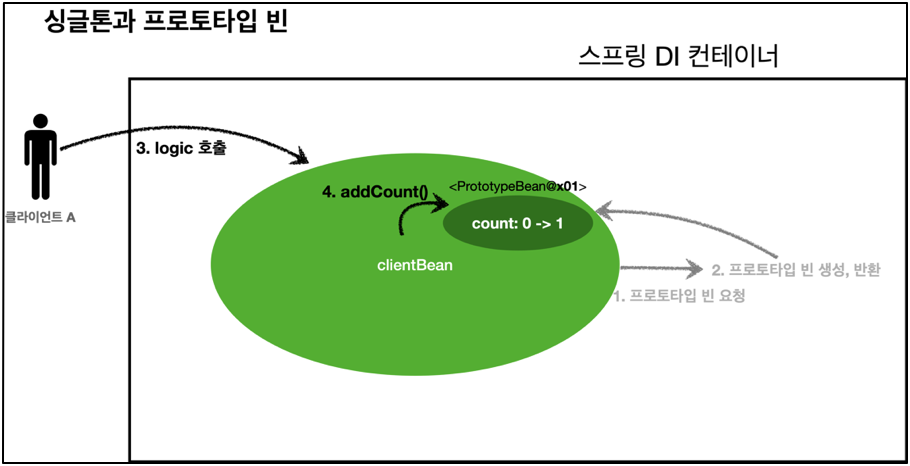 2. 스프링 컨테이너는 프로토타입 빈을 생성해서 clientBean 에 반환한다. 프로토타입 빈의 count 필드 값은 0이다.